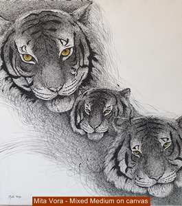Mita Vora’s art is centered around the majestic tiger, symbolizing physical strength, vitality, and health. Through the use of ink and palette knife on canvas, Vora skillfully brings these powerful creatures to life. Her commendable and brilliant style involves a universal mix of raw and bold layers of colors, reflecting subtle values and positive attributes associated with the tiger.